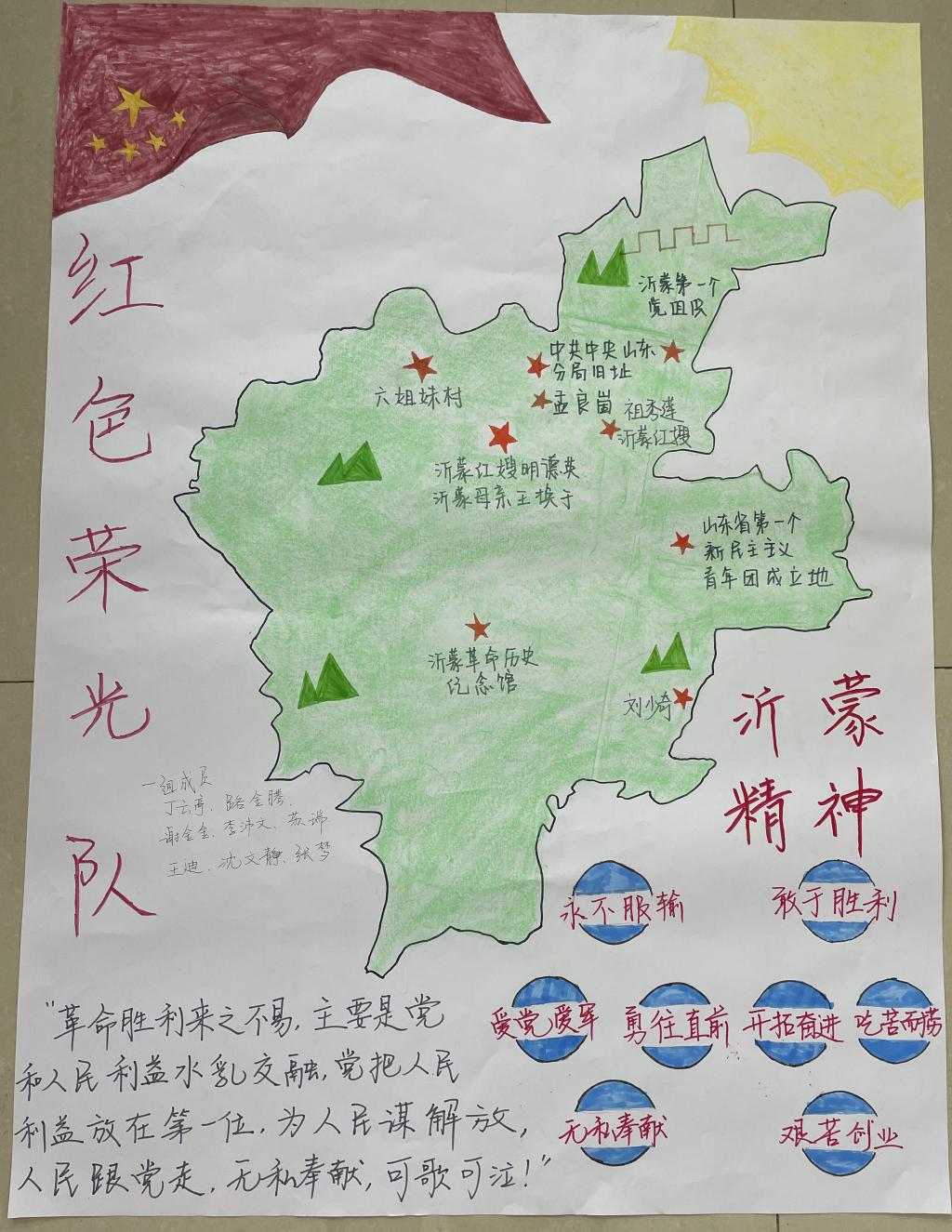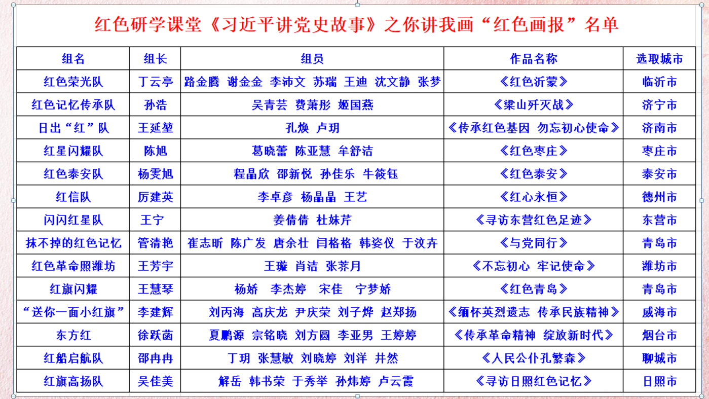 在研学过程中,同学们分成小组,以“我讲你画”的方式,讲山东红色故事,画山东红色足迹,深刻认识和理解山东“红色地标”、“红色人物”、“红色故事”等红色基因,深入挖掘山东16个城市的红色资源,图文并茂地绘制了具有各地市红色特征的画报,同心向党传承山东红色文化及其时代价值。